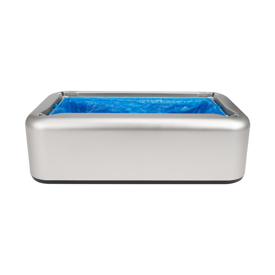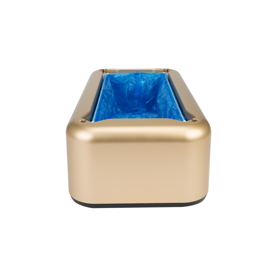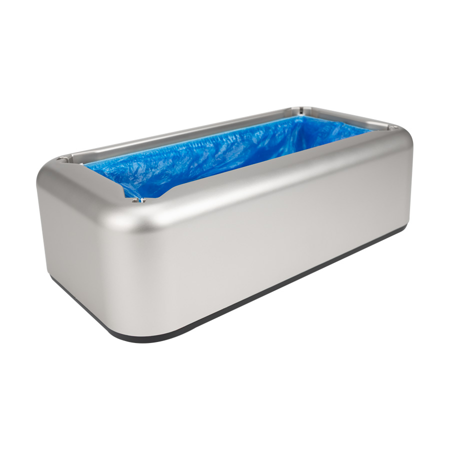 Dispensador de plástico ABS con estructura metálica, para Cubre-Calzado industrial. En cada pisada, entrega cobertor bolsa plástica de PE azul, ideal para mantener el calzado protegido de virus y bacterias en ambientes protegidos. Cada dispensador viene con 10 bolsas protectoras de calzado de PE (R18) de regalo, que se adhiere al calzado en forma automática en cada pisada dentro del dispensador.
