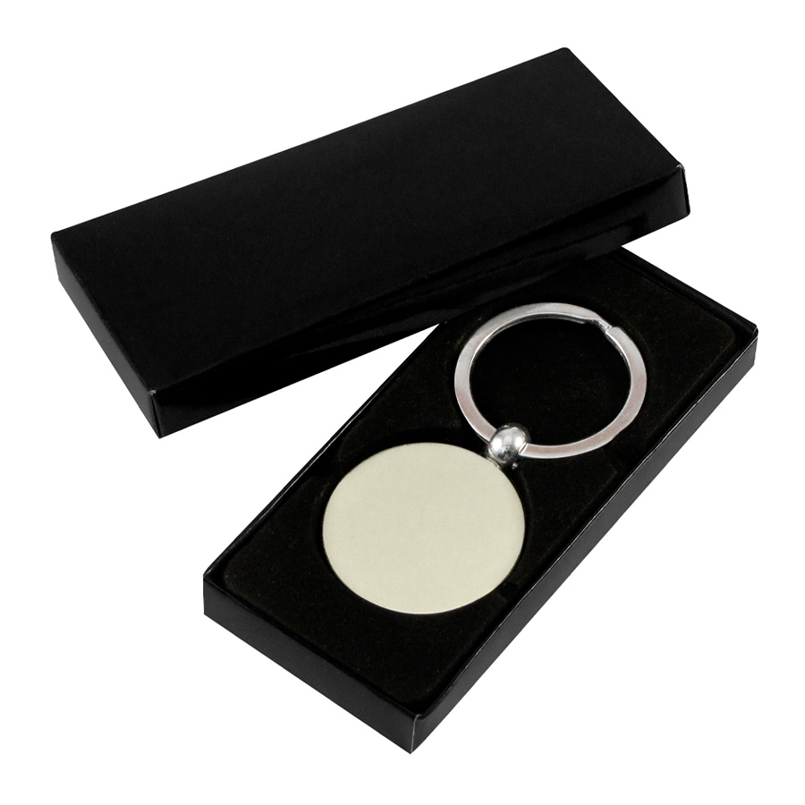 Llavero Metálico Redondo Plano. Presentación en estuche laminado negro con cuna aterciopelada.