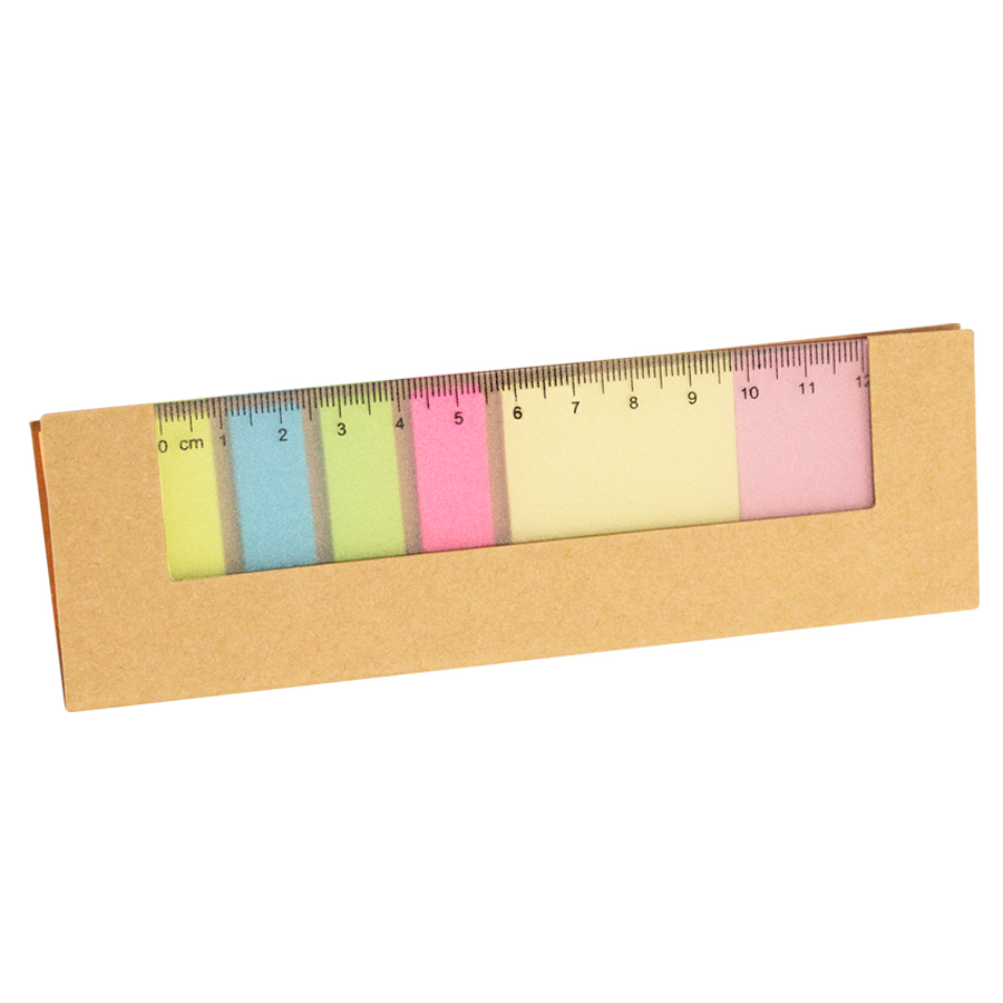 Memo Set Ecológico con Regla 12 cm, incluye notas adhesivas cuadradas en 2 colores y banderitas adhesivas en 5 colores.